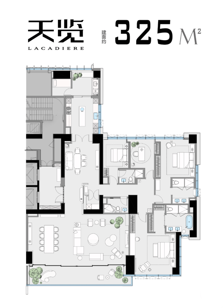 325m²,半层一户,刷梯入户,三梯两户,四室三厅4卫,尊享三套房,层高3.5米,