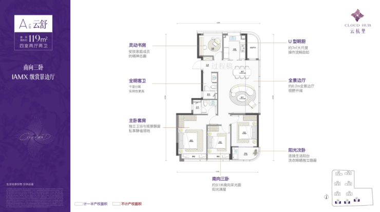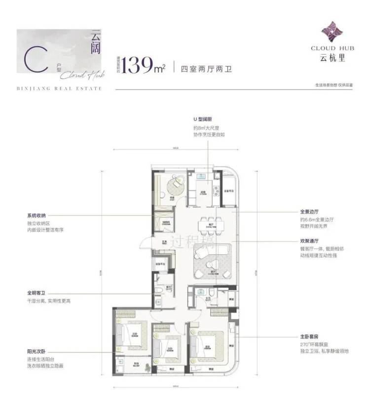 建面约139方4房2厅2卫边套,实得率约91%,布局“优秀”。全封闭式阳台,三面采光,观景视野无敌。