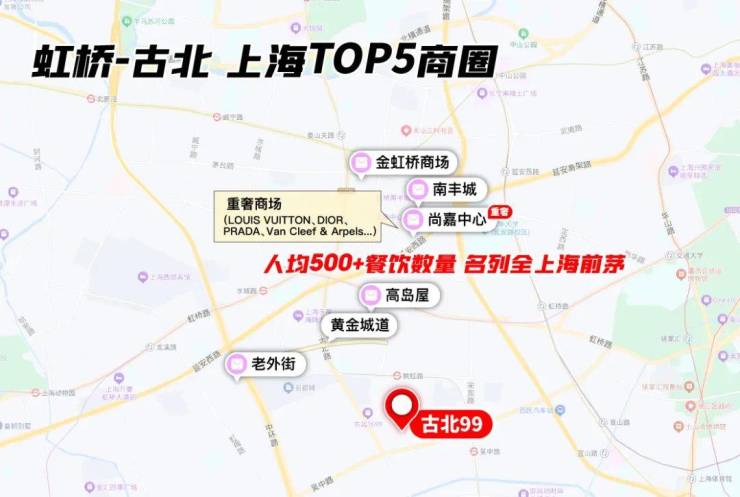 虹桥-古北一带人均500+餐饮达到80+家(作为对比,外滩和南京西路都是70+家),足见这个片区居民的消费力之强。(数据来源网络,仅供参考)