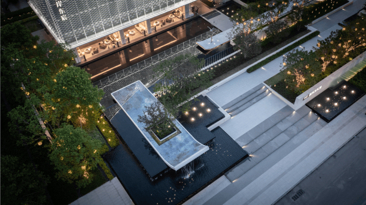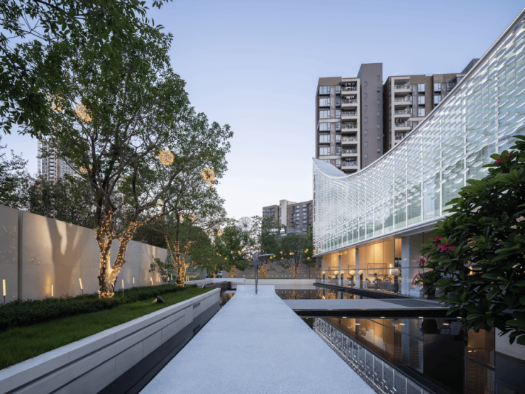 项目主体建筑是富有艺术感和昭示性的帆之形,简洁现代。景观设计延续建筑的元素与意韵,将人文意境和现代艺术融合,以风帆和江山进行抒意。引入跌落的水瀑,以颇具质感的石材挡墙与轻巧的玻璃格栅区分边界,利用台阶巧妙消解场地高差的同时,强化轴线景观的序列感与仪式感。