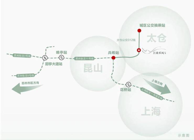 项目邻靠前进路、胜泾路、烟沪线(204国道),便捷接入两高(京沪/沈海高速),同频太仓“5+1”轨道交通网络(建设中),公交路线312路自江南禾风站,向西链接苏州轨交11号线,向东至科教新城客运站换乘60路,102路,112路,128路,以多维立体交通便捷出行长三角。(资料来源于太仓发布官微)