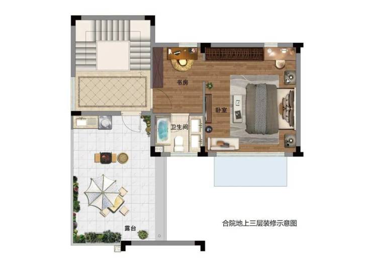 二层三层所有房间均做了南向套房设计,尤其还做了双主卧套房的概念,这正是基于深度解读了合院类客户的需求。房间不追求多,但尺度和舒适度上必须奢侈,不论是作为长辈房还是子女居住,舒适性是首要考量。