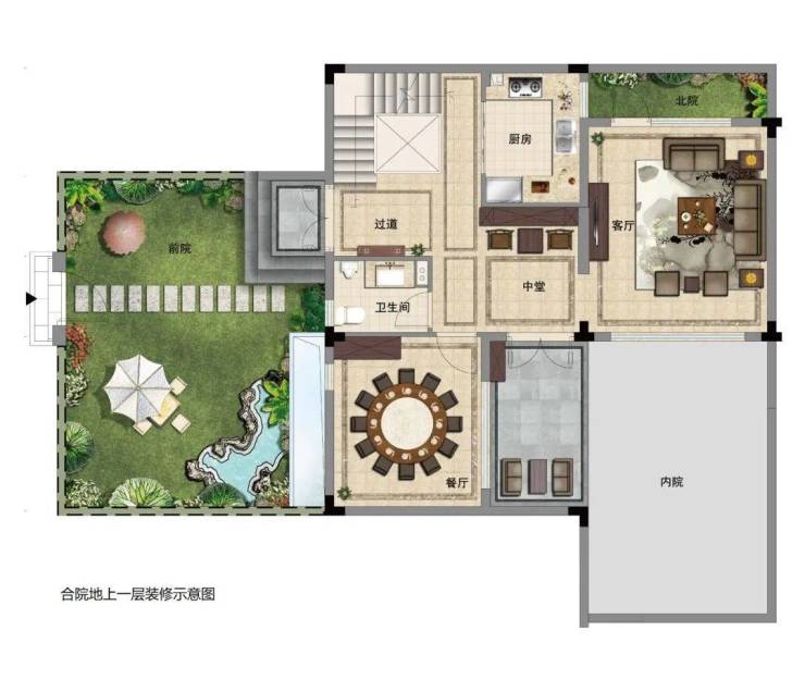 合院一层奢享三重院落,与餐客厅贯穿,形成惬意生活的动线,未来业主可以合理利用将此地打造成户外棋牌空间、茶室等皆可,于此从容接待众多亲朋好友。