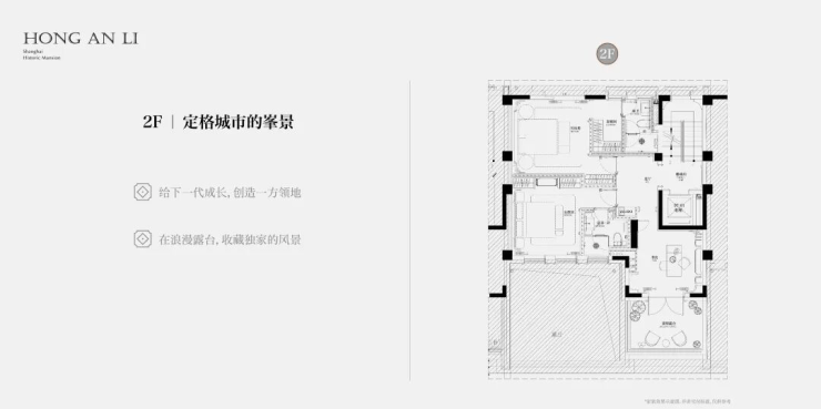 客厅互通,彰显家族生活的轩阔厅堂,2F家庭层,儿女的幸福与陪伴皆在左右,3F总裁套房式Penthouse,用具象的尺度描写人生成就的高度。
