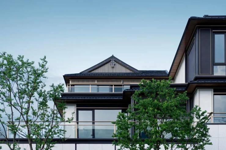 蓝城精研宋代建筑美学,,撷取经典歇山顶、悬鱼、鱼鳞瓦、垂花柱、挂落等宋式建筑语言,融合现代人居,于诗意山水间,全方位筑造当代优雅山水栖居。