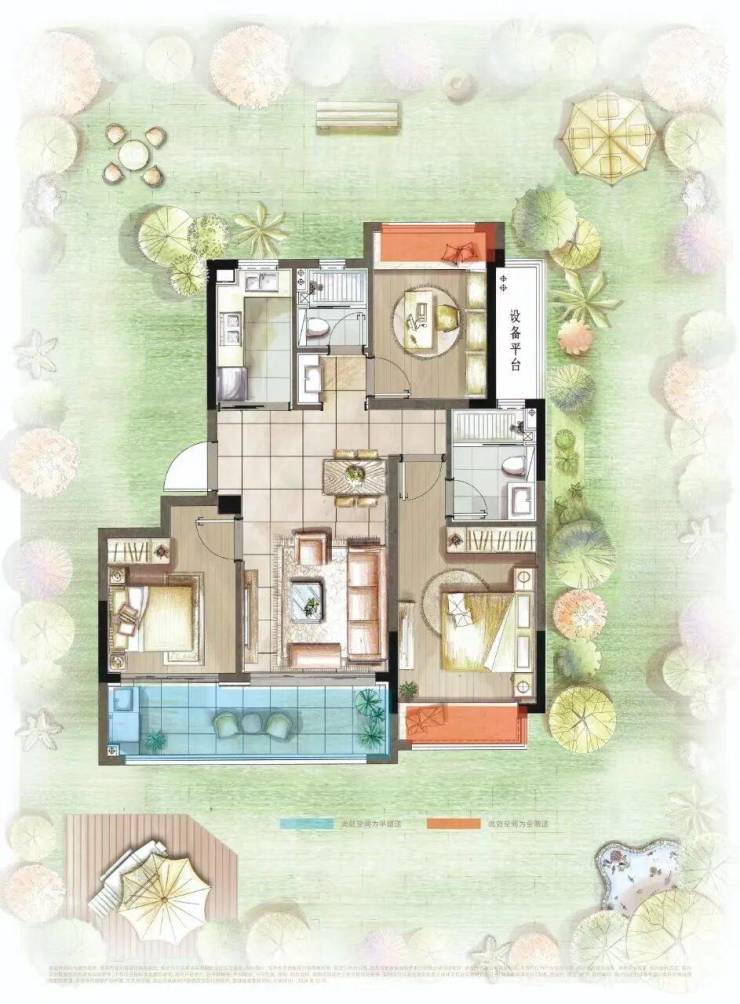 •270°环幕阳台联通南向双卧室,专层寝卧三房双卫设计。