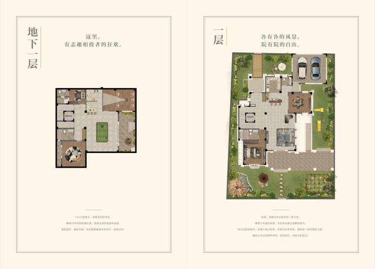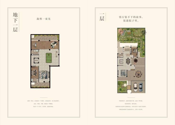 一楼:均采用了南北双入户的方式,带来了南北通透的连体超大花园,停车位设在北向,并且拥有独立的观景餐厅设计,还额外设计了超大入户平台,为住户提供了更多的便利;