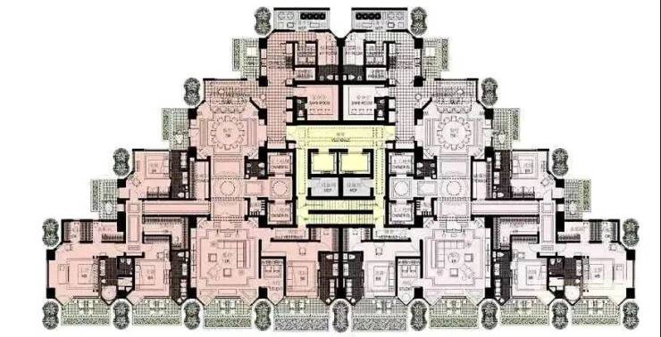 项目独特的金字塔户型设计,仪式感超强:南侧住宅平面采用了三角形造型,四间豪华套房,超大客餐厅,充分利用南向面宽,不浪费一丝一毫江景,并且每个房间都有超大阳台。