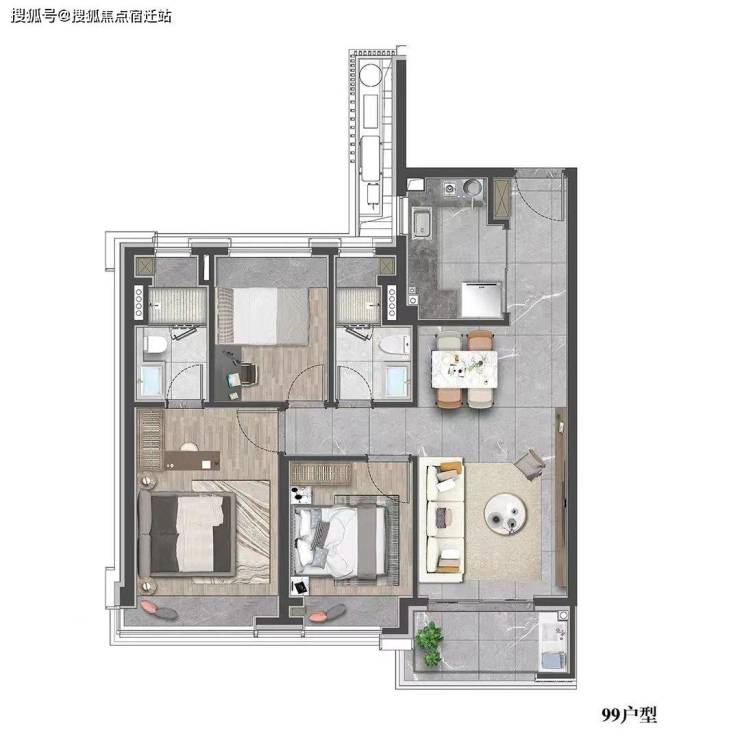 建面约99㎡的三房设计,在空间上使用功能更加多样化,一站式解决了家庭生活的所有功能,优化居家动线,大大提升空间的居住体验。