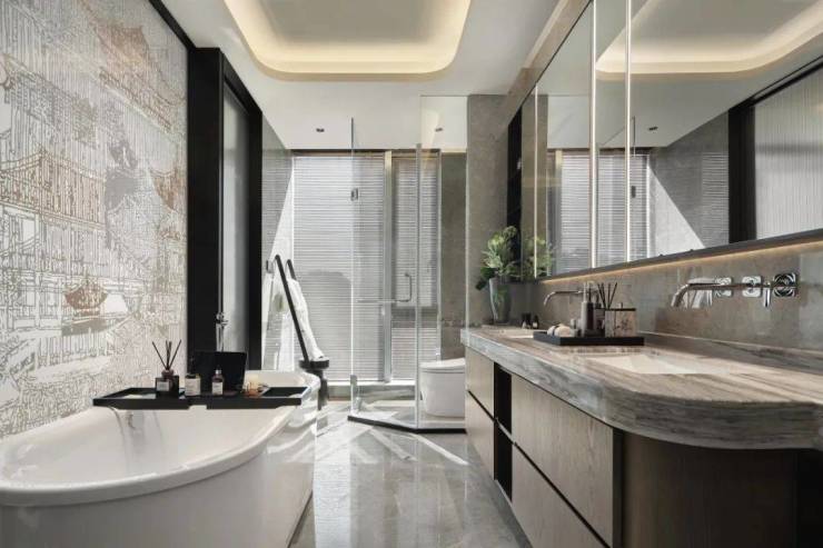 卫浴间硕大舒适的大理石台盆,搭配大面的无边框全面镜,带给男女主人尊贵的盥洗体验。洗浴空间采用电镀夹丝玻璃隔断,主卧和主卫的整体视野更加通透。独自泡澡的同时,欣赏幕墙外的景色,打造全新的生活品质体验;在需要隐私保护时,打开电镀功能即可。卫浴间采用洄游动线,大大增加了整体空间体验感。