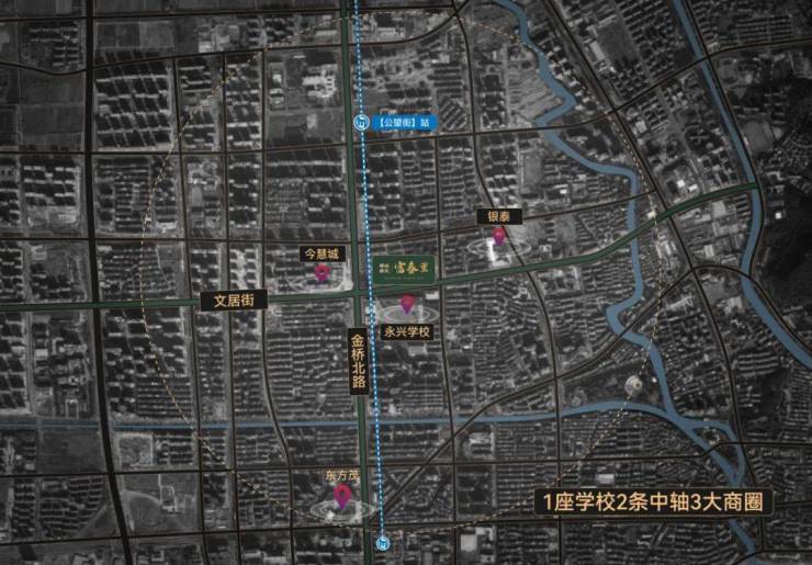富春金街雄踞富阳老城中芯,位于“黄金十字轴”交点,“南北大中轴”金桥北路与“东西大中轴”文居街交汇处,2大主干道源源不断输送客流。同时直距地铁6号线【公望街】 站约600米,富阳融入杭州主城的核心动脉,迅速串联江河汇、奥体、滨江等重要区域,属于众商必争之地。(直线数据来源于百度地图)