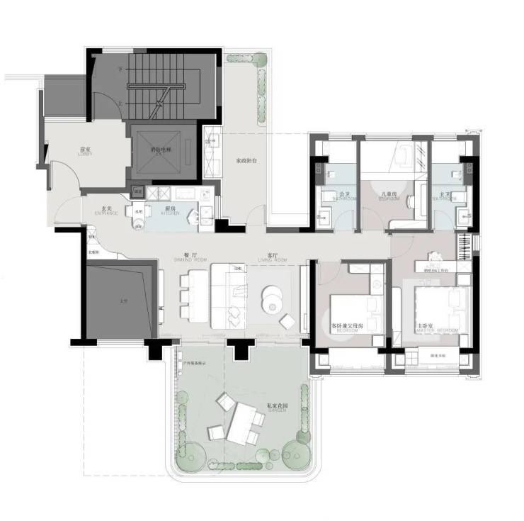 规划全龄段运动空间、亲子乐园等;把公园搬入小区内,植被疏密有致,一步一景。