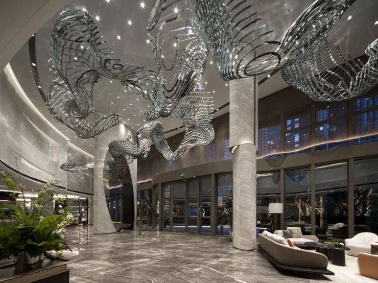 驱车从吊顶饰有灯带的明朗地库进入,电梯上来,便是面积约1300㎡、挑高约9米的超级酒店式大堂。