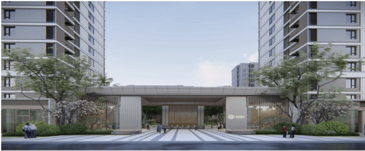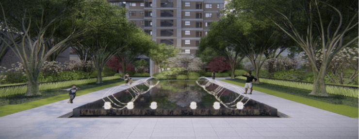归家礼仪升级-打造小区主入口礼仪广场:入口后花园,是约20米跨度的礼仪广场,搭配迎宾树列、镜面水景跳泉、林下休憩空间,仿佛置身于私家花园;