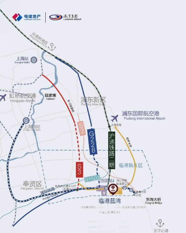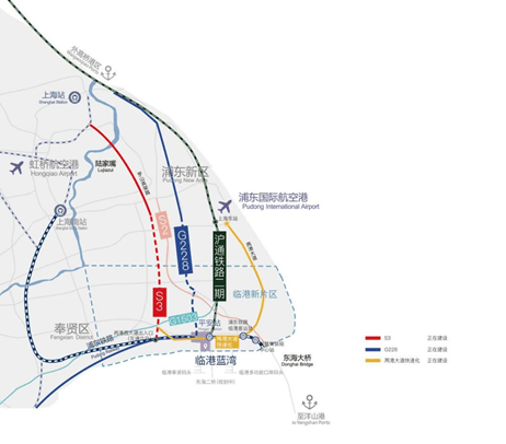 其中两港大道串联临港蓝湾与临港主城区;S3沪奉高速(在建),迅捷抵达张江。