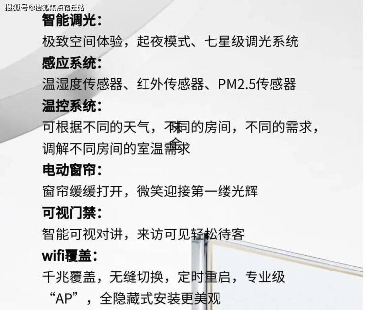 德国摩根·用科技创变生活智能调光:极致空间体验,起夜模式、七星级调光系统感应系统:温湿度传感器、红外传感器、PM2.5传感器温控系统:可根据不同的天气,不同的房间,不同的需求调解不同房间的室温需求电动窗帘:窗帘缓缓打开,微笑迎接第一缕光辉可视门禁:智能可视对讲,来访可见轻松待客wifi覆盖:千兆覆盖,无缝切换,定时重启,专业级“AP”,全隐藏式安装更美观
