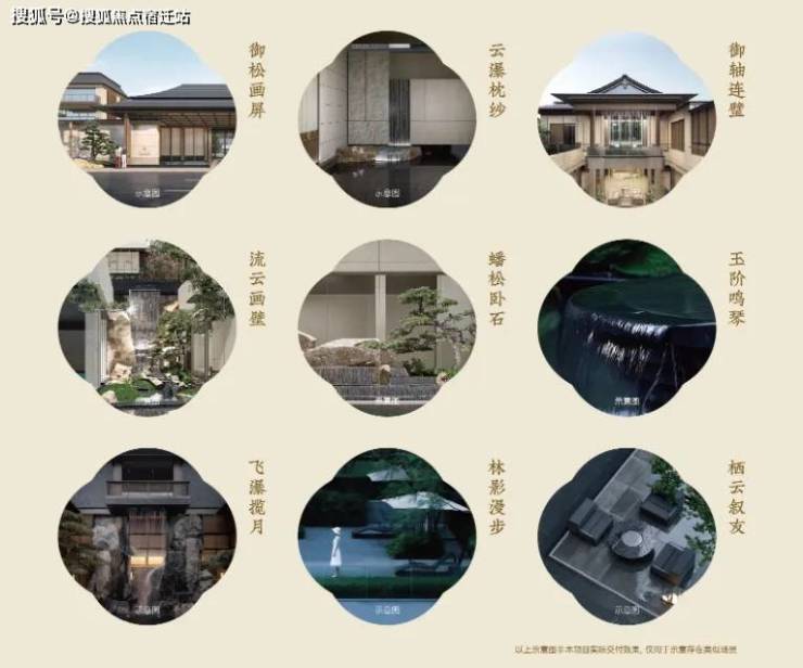 御松画屏——云瀑枕纱——御轴连璧——流云画壁——蟠松卧石——玉阶鸣琴——飞瀑揽月——林影漫步——栖云叙友