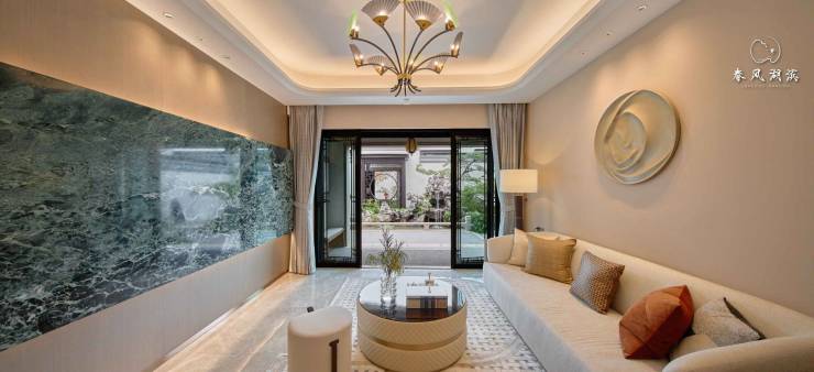 坡屋顶、深挑檐、描摹中式建筑神韵;大面落地窗,蓝灰色LOW-E玻璃,让阳光照进每一寸空间;内敛的建筑气质、沉稳的质感、舒适至上的空间,营造融于湖光天地的美好温度。