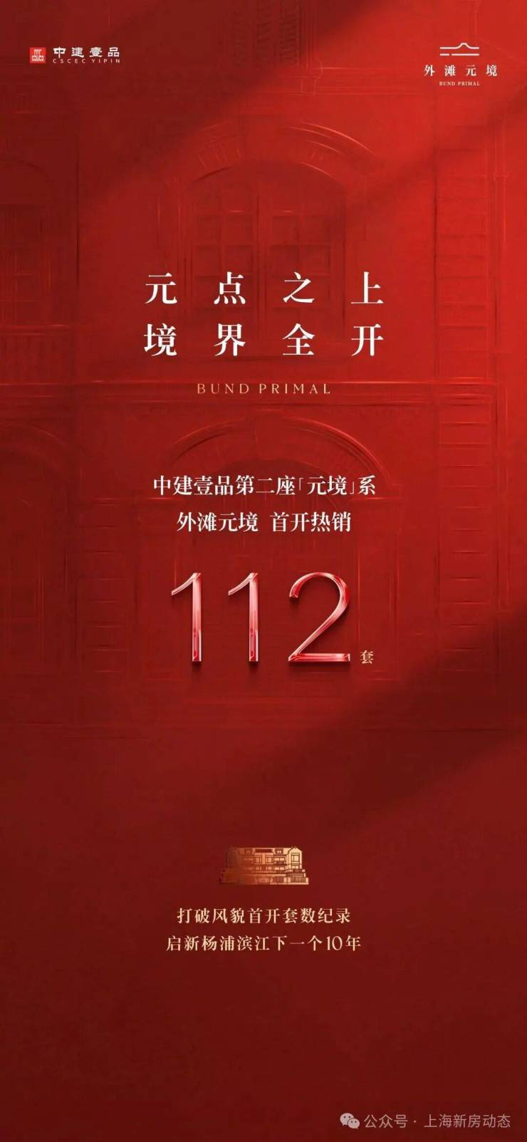 继北京海宸元境首开大捷后,1月22日,中建壹品第二座“元境”系作品——外滩元境正式开盘,首开热销112套,去化率突破82%,一举拿下上海风貌产品首开去化套数纪录,这也是中建壹品继浦江之星、华忻坊、外滩源著后,又一个杨浦滨江封面作品。