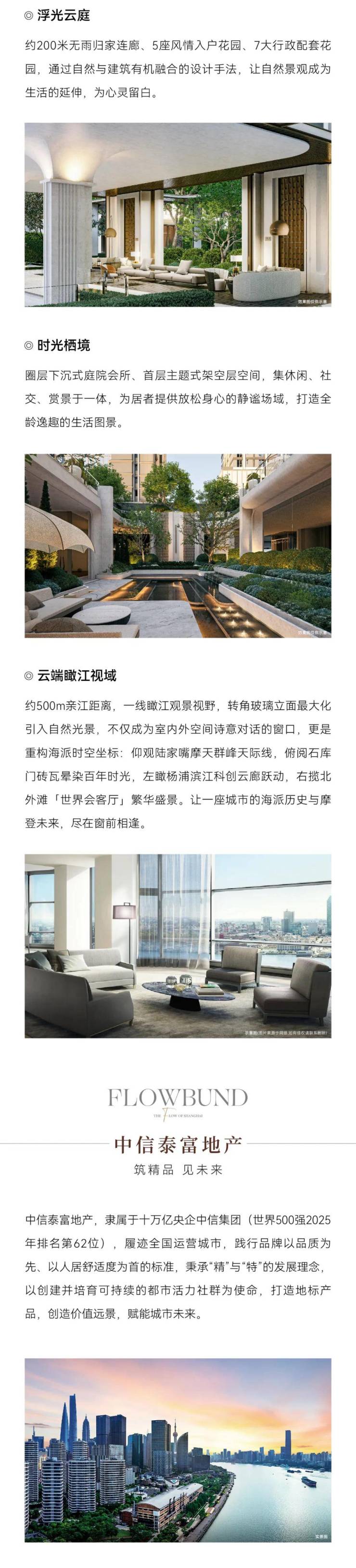 三、 收藏级资产与永续价值 中信泰富外滩道,是中信集团献给上海的时代藏品。它超越了物理空间的桎梏,将百年外滩的深厚底蕴、内环滨江的绝版地段、顶豪社区的纯粹圈层、以及央企精铸的品质承诺,熔铸为一处可传承的精神坐标。在这里,每一次凭窗远眺,是对城市繁华的从容掌控;每一次归家步履,是身心安顿的诗意栖居。