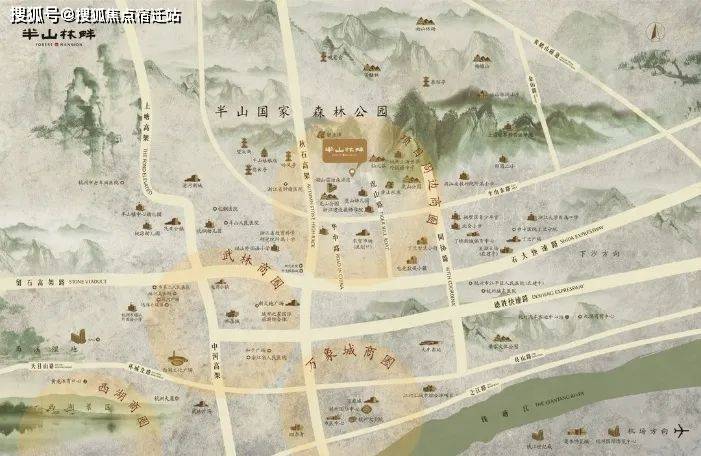 【项目四至】紧邻半山国家级森林公园 半山、龙山、虎山三大公园连通,组成一个大的半山森林公园,公园总面积约172公顷,总长23公里的游步道,森林覆盖率90.1%,空气负氧离子平均每立方厘米4000个,空气中细菌浓度也大大低于城区,森林公园多年平均气温16.5℃,年平均湿度80%左右,堪称杭州城区的森林氧吧