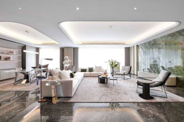 在建筑外部立面,采用整栋楼纯石材干挂与玻璃幕墙结合,庄重的价值感与现代流线融合出经典之美。多玻璃少墙体的设计,也让整个室内空间拥有了360°的全幕环景视野,将窗外的纯正法式两大中央景观公园坐收眼底……一层一户的大胆设计,追求的是居住者的绝对享受,大平层的居住真谛,在丰盛九玺被诠释得淋漓尽致。