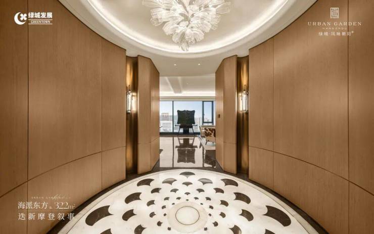 一进门便是气度如宫殿般的十字圆厅:灰色皮革墙面、高悬的玻璃艺术品和银杏叶地面拼花,归家仪式感拉满。