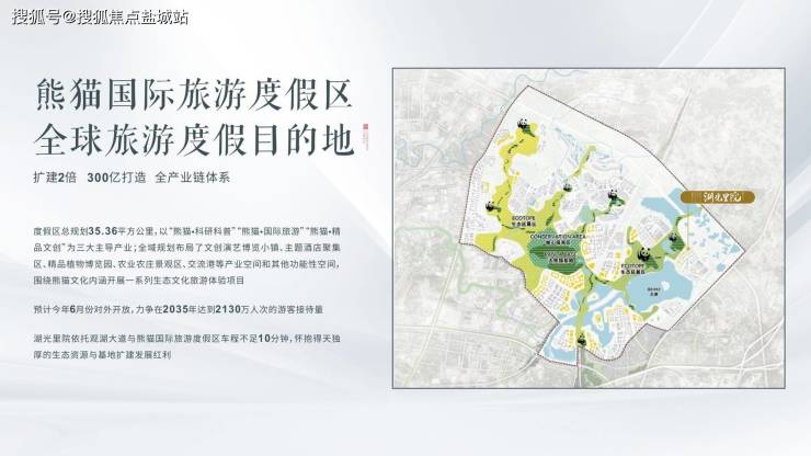 全球旅游度假目的地,度假区总规划35.36平方公里,以“熊猫·科普科研”“熊猫·国际旅游”“熊猫·精品文创”为三大主导产业,围绕熊猫文化内涵开展的一系列生态文化旅游体验项目,已开放,力争2035年达到2130万人次的游客接待量,项目距离熊猫旅游度假区车程不足10分钟,享得天独厚的生态资源与区域发展红利。