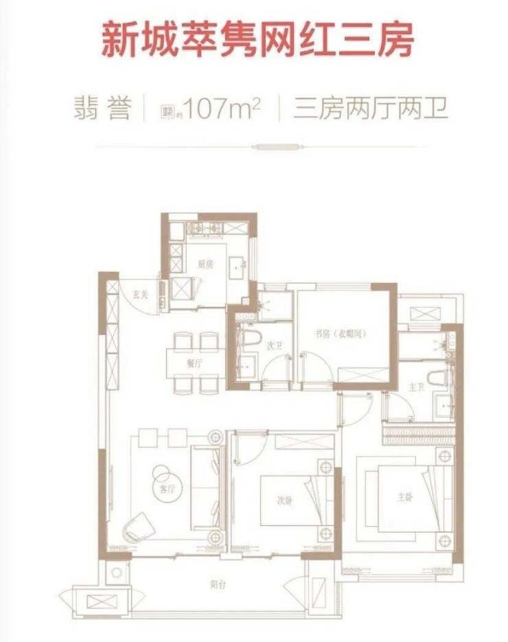 功能齐全:三室两卫设计,主卧带独立卫生间,次卫三段式布局,缓解动线冲突。