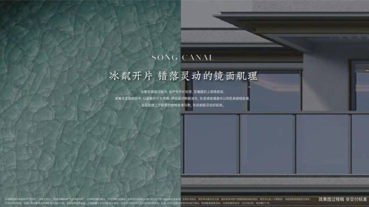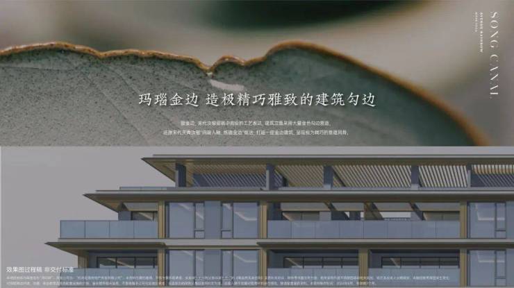 项目以现代审美和设计手法,提取中式美学造极时代的宋式美学,排屋、叠墅立面首层采用大面积淳如玉釉的白色石材,二层及以上立面以大量金色勾边营造,古铜深色作为檐口插色低调内敛而富有华贵意蕴建筑。