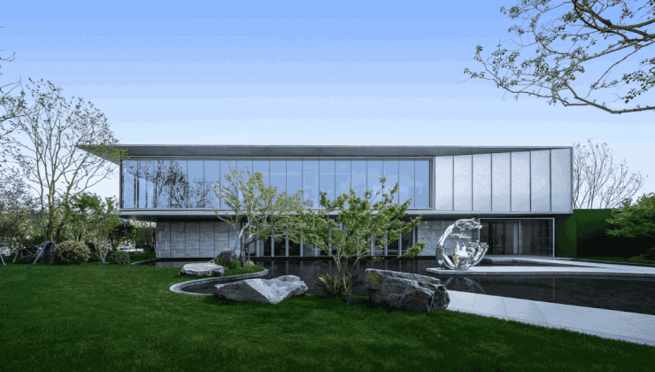 示范区的矩形体块通过细部设计转译为山水元素,以呼应金陵山水的主题。建筑一层于玻璃面之间设仿石材立柱,寓意山的厚重;二层悬挑体量通过上下两层檐口的收分设计,寓意山的姿态。在成本可控的前提下,建筑呈现出雕塑般的质感,简约刚劲而富有意境。