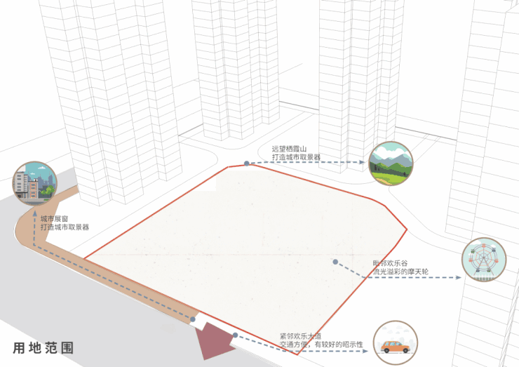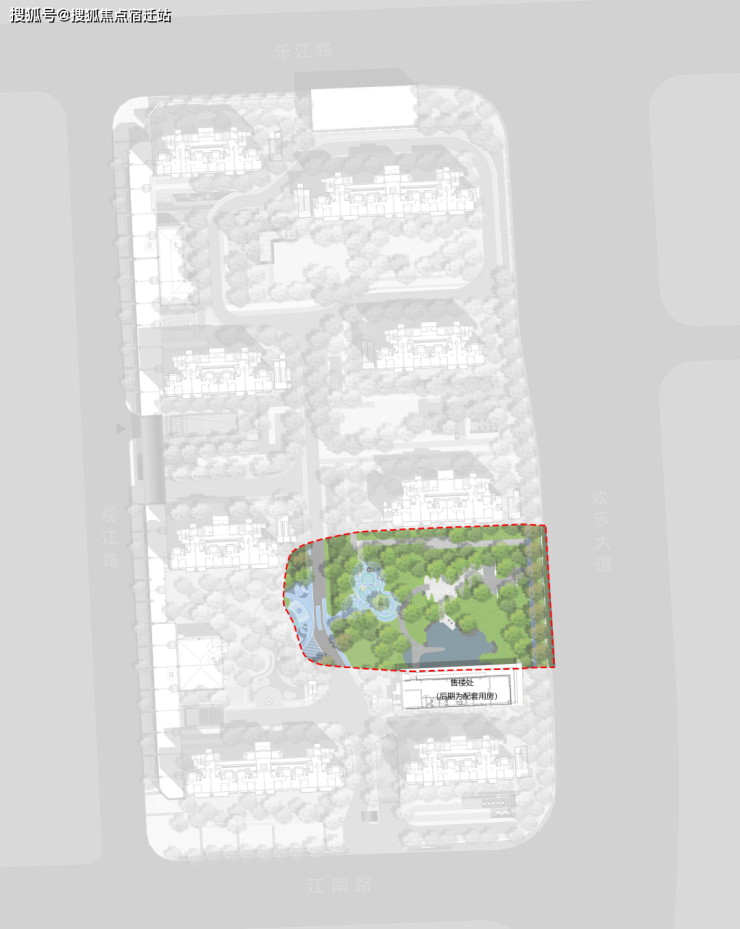 项目总图设计延续城市脉络,在极其有限的场地条件下,形成了花园与轴线序列;住宅塔楼呈南低北高布局,商业位于地块西侧,东侧则完整保留了朝向欢乐谷的景观视野,形成富有变化的天际线;示范区设计最大化程度考虑了未来大区的功能协调性,和景观可逆性,力求在规划条件、成本控制、营销展示、品质呈现四个维度形成设计最优解。