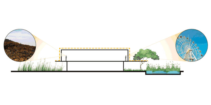 示范区西侧是栖霞山,东北为欢乐谷的摩天轮,自然与城市的生活场景在此交融重合。设计通过水与院的打造,将远处的山景和城市摩天轮纳入到场地之中,使示范区成为空间和景观的连接,“城市取景器”的设计构想形成漂浮的空间。