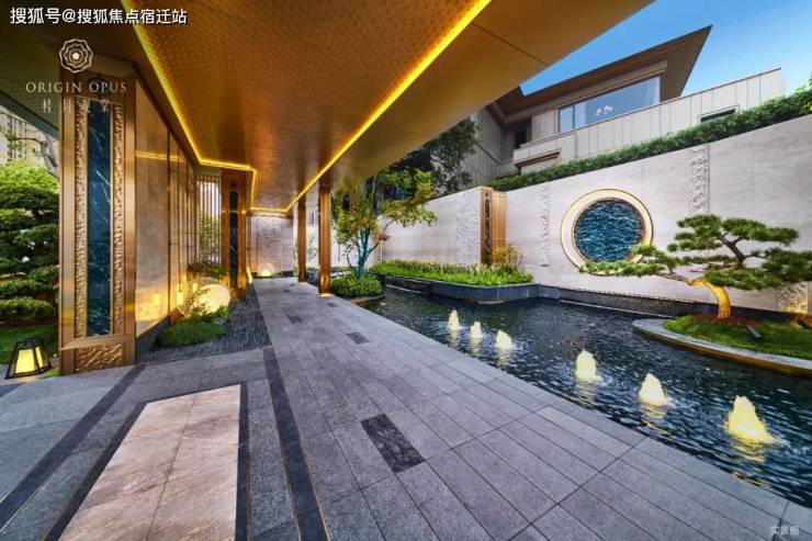 入户两侧水景清泉涌动,婉转迂回,一座精致的宋风美学馆展示在眼前。透过门框衬映出满月景墙,甄选名贵奢石,在虚实掩映间延续着东方诗意山水的写意画卷。