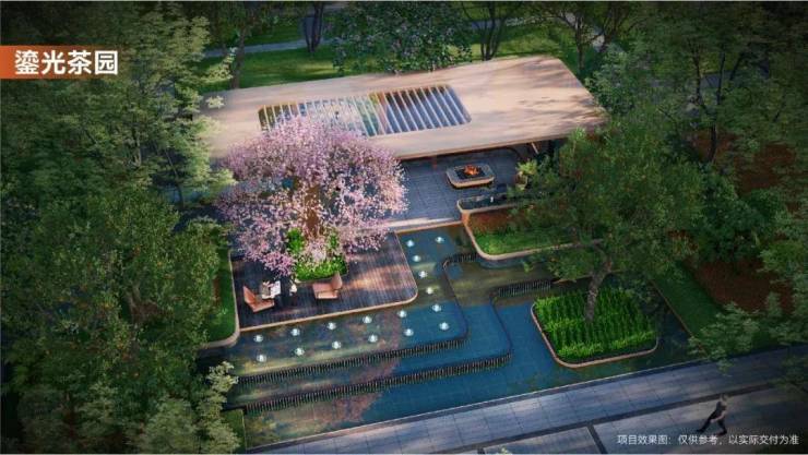 南北向悬岛庭院式归家入口,贯通水幕庭院、鎏光茶园,途径入户花园,归家入户,一路风光流转。