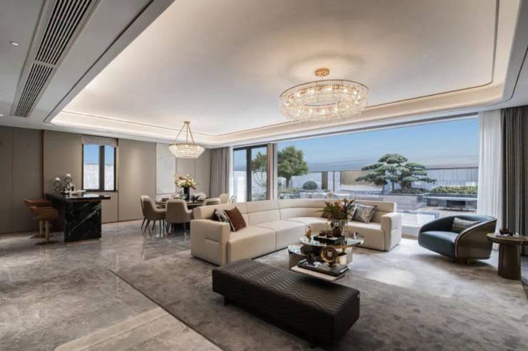 走进翠璟和庄,首层餐客厅的全景落地窗设计令人眼前一亮,窗墙比超过80%,仿佛为室内空间装上了一扇“一体无界屏”,将室外的风景毫无保留地引入室内,让自然光线与室内空间完美融合,营造出开阔而通透的居住氛围。约5.8米挑高地下空间,可自由打造夹层,满足多元生活需求。