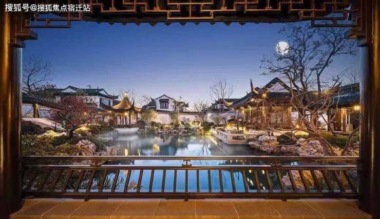 室外庭院精装,包含半亭、太湖石水系、连廊、花间铺地、石板桥等