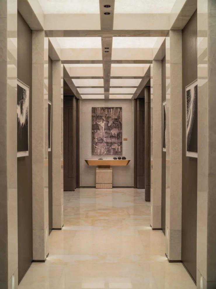 步入门厅,便是层高约4.2米的空中艺廊,从地板到天花,皆为白色玉石通铺。