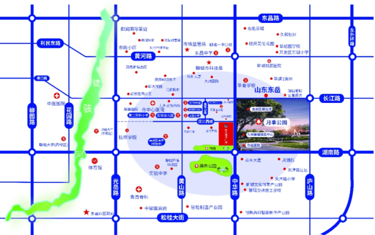 位于聊城高新区的核心位置,东侧毗邻月季公园,聊城高新区主干道中华路与湖南路的交汇处,项目位置优越,道路通达良好。