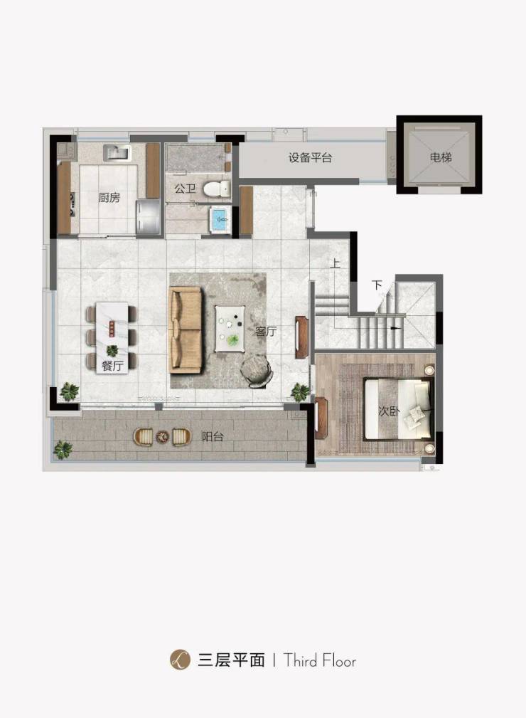 下叠四房两厅三卫的设计。一层南向整体面宽约10.8米,餐客厅一体,连通约7.2米的长阳台,大横厅与落地窗的搭配,增加了室内空间与庭院的互动。一层独立入户,南北通透客餐厅一体的起居空间,足以容纳一个大家庭的节日聚餐或是一场精致的下午茶party。