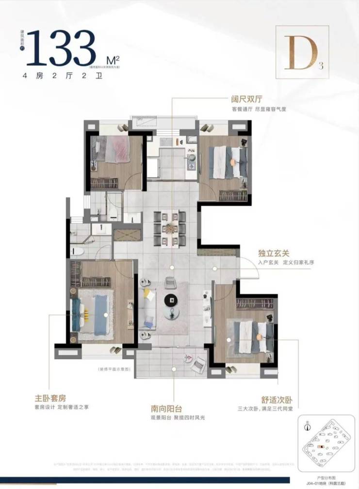 (本户型图为“世界顶科社区·玖海云天”43号楼19单元501室的装修示意图,仅供参考,不作为要约或销售承诺。户型分布图仅为户型面积段示意,楼栋比例、位置关系与实际存在差异,仅供面积段选择示意参考。其装修、家居、陈设等不属于交付范围,也并非交付标准。不同户型的面积尺寸,功能布局,空间分割等均有不同,相同户型因楼栋、楼层、单元、房号等差别,局部结构、朝向、面积等也可能不同,具体以政府最终审定的图纸和销售合同为准。有效期至2024年2月。)
