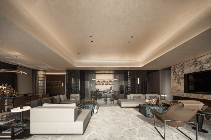 长桌石材深沉的纹理,在餐厅内映衬着波浪形吊灯,光影在金属与石面间流转。暮色下,餐椅围合出附有礼序的交流场域,光线沿着窗边柜体,映照出餐叙时刻的暖意。