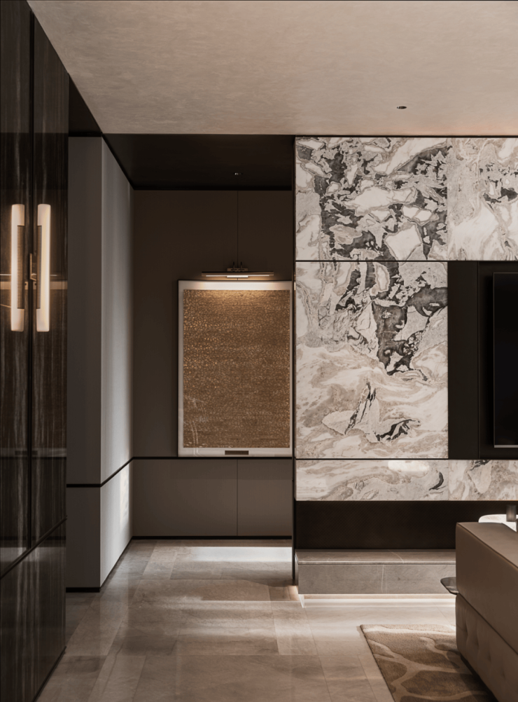 玄关是生活叙事中留下的第一口呼吸。深色木饰墙面与金属肌理装置并置,水纹般石材的走向轻轻引导视线。扇形弧线拼花地面,以金属嵌条细密收边,光在弧面与金属之间被柔和折返。肌理玻璃嵌入哑光金属格栅,在视线的渗透与阻隔之间形成微妙平衡。