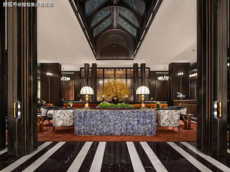矗立两旁的是进口奢石巴西乌金石打造的大理石柱,庄重典雅。点缀画面中央的是玻利维亚蓝,这是世界上储存量极少的石材之一,被称为奢石中的劳斯莱斯。地面的拼花灵感来自伦敦瑰丽酒店,黑白相间,给我一种神秘厚重的感觉。