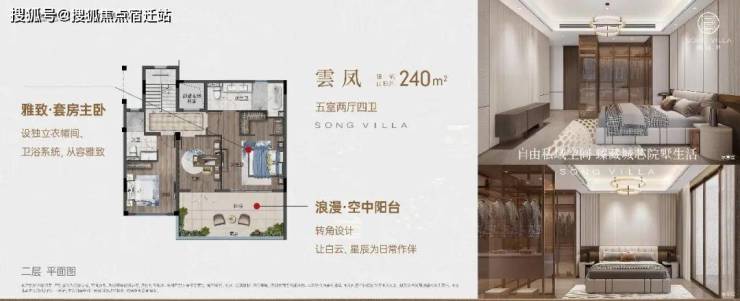 二层雅致套房,设独立衣帽间与卫浴系统,主卧连通转角大阳台,观景静度,皆优雅舒适;南向舒适功能次卧,既满足家族同堂之乐,亦为待客休憩预留空间。