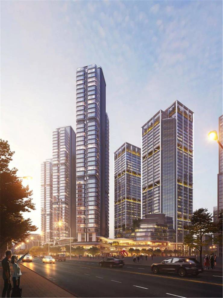 项目由7栋最高约200米的建筑组成,总建筑面积约50万㎡,涵盖了摩天楼宇集群、互联网总部IT&Mall、国际潮流商业街区等多种业态。整体设计由英国高技派大师福斯特的Foster+Partners操刀,景观设计由AECOM、室内设计由HBA、照明设计由BPI共同完成,确保每一个细节都达到“世界级地标”的标准。