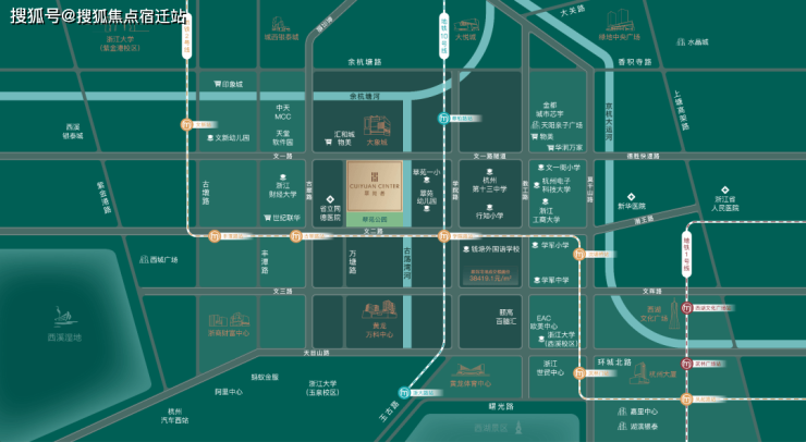 翠苑荟项目位于文一西路与古荡湾河交汇处,这里也是杭州主城第一代CBD所在地,可达西湖、西溪湿地。同时,项目周边地铁2号线学院路站、在建地铁10号线翠柏站双地铁环绕。黄龙万科中心、EAC欧美中心、华星时代广场等高端写字楼聚集,也为翠苑荟这个项目划定了最纯粹的客群。