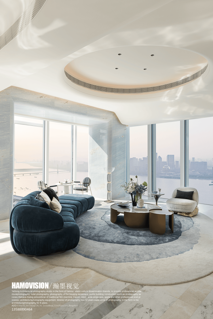 最小套内面积260㎡,通过可拆卸隔墙实现"3+1"空间重组(卧室/书房/客厅/SPA房自由切换)。层高3.5米搭配270°环形落地窗,窗地比达1:1.8,超越《住宅设计规范》GB50096-2011标准。