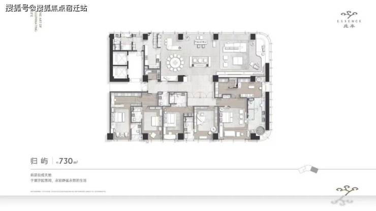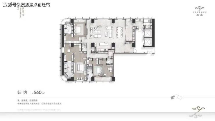 叶飞设计的(建面约)560㎡归逸样板房。户型很规整,南北通透、动静分区,做了四套房还带双阳台。