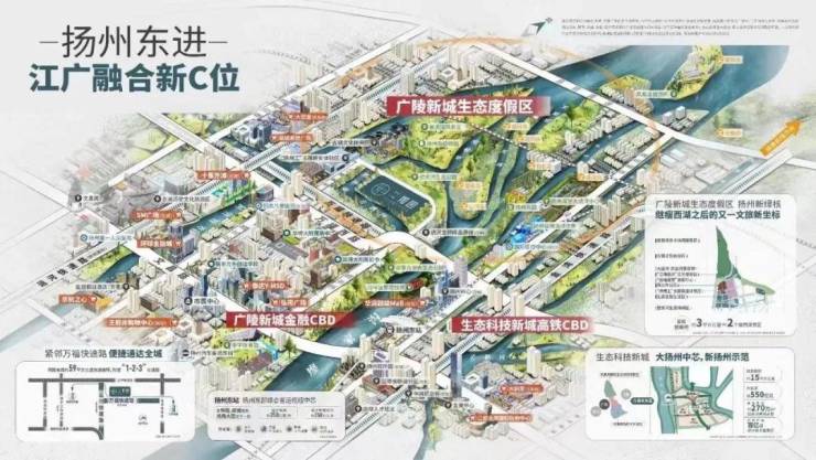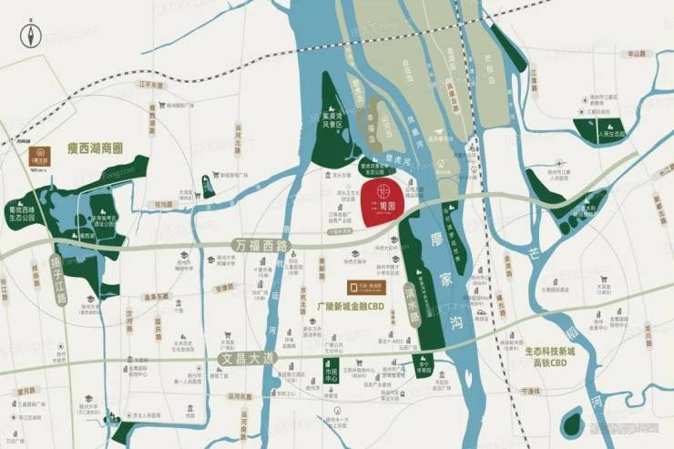 【地段】:广陵新城稀缺的一块两面环水、两面环公园,且四周围完全被景观绿化、4A级风景区、度假区、保护区所环绕的沿河景观地块。距离未来高铁CBD、未来扬州中心、扬州塔、华润超级mall、印象馆仅6分钟车程